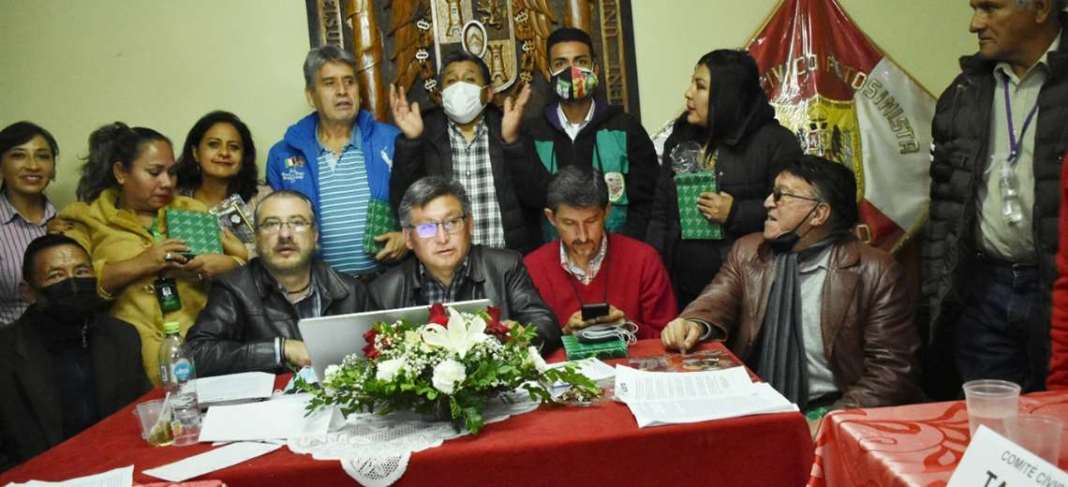 “Repudiamos la persecución de los líderes cívicos, ciudadanos, policías, militares trabajadores de educación, salud, autoridades electas, resistencias juveniles, juntas vecinales, plataformas y de todos quienes defendieron la vida y la democracia, por lo que apoyaremos y participaremos en todas las movilizaciones en defensa de nuestros derechos, como la gran marcha nacional del 10 de octubre y el paro nacional movilizado del 11 de octubre”, dijo en su lectura el presidente del Comité Cívico Potosinista, Juan Carlos Manuel.