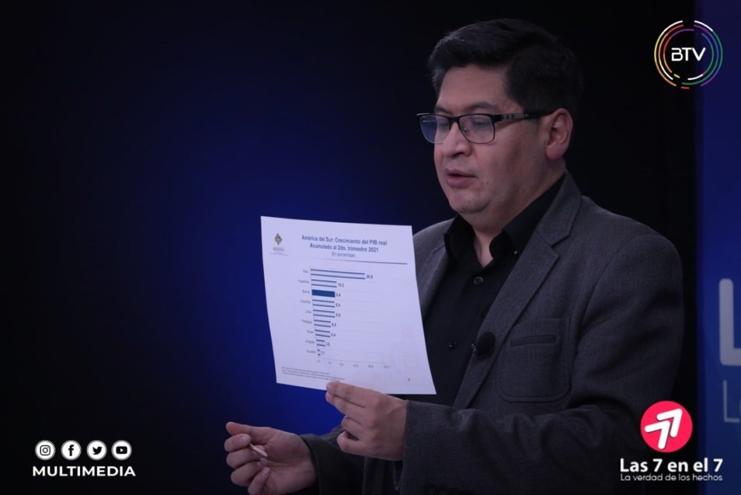 “El crecimiento del PIB, en términos del IGAE (Índice Global de Actividad Económica), alcanzó a junio de este año un 9,4 por ciento, mientras que en el mismo periodo del año pasado (2020) estábamos con el -12,9 por ciento, por tanto, vemos una recuperación muy importante de la economía nacional”, dijo la autoridad en el programa Las 7 en el 7 de Bolivia Tv.