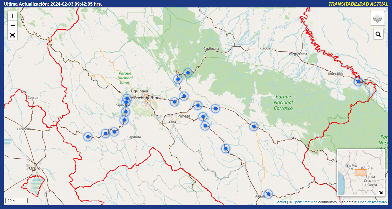 Un reporte difundido por la Administradora Boliviana de Carreteras (ABC) sobre la transitabilidad de las carreteras, da cuenta que aún persisten varios puntos de bloqueo (ver puntos azules del mapa) en contradicción a varias informaciones de la víspera en sentido que habrían sido levantados los puntos de bloqueo.