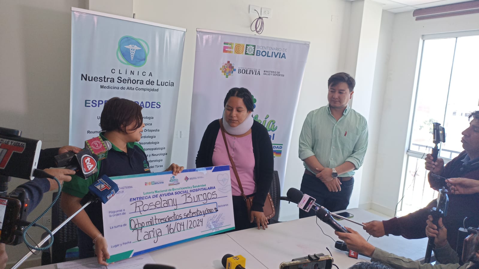 Maria Nelida Acuña, directora de la Lotería Nacional en Tarija, encabezó la entrega de un monto significativo de 8.265 bolivianos a Rosaleny Burgos, una periodista local que sufrió un grave accidente en motocicleta mientras realizaba su trabajo. Este gesto solidario se llevó a cabo para cubrir los gastos médicos relacionados con una cirugía de emergencia que necesitaba.