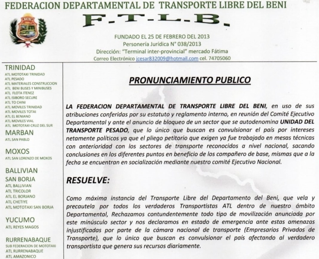 Esta federación beniana, en uso de sus atribuciones conferidas por su estatuto y reglamento interno, llevó a cabo una reunión del Comité Ejecutivo Departamental ante el anuncio de bloqueo de un sector que se autodenomina “unidad del transporte pesado”.