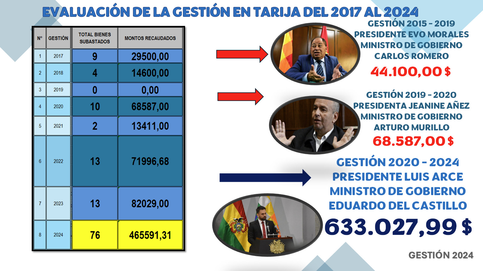 “Para Dircabi Tarija fue un éxito total la recaudación en la gestión 2024, debido a que logramos superar las cifras de muchas gestiones anteriores”, enfatizó Ayllón. Según el informe, la recaudación alcanzó los 465.000 dólares, gracias a la subasta de 76 bienes. Este resultado incluye la venta de 38 vehículos, 37 cabezas de ganado y un bien inmueble ubicado en el municipio de Villa Montes.