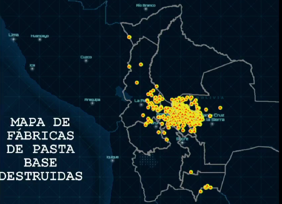 La información georreferenciada incluye los laboratorios de cristalización de cocaína que fueron destruidos, que también demuestra que la mayor cantidad de éstos estaban en los departamentos de Cochabamba y Santa Cruz.