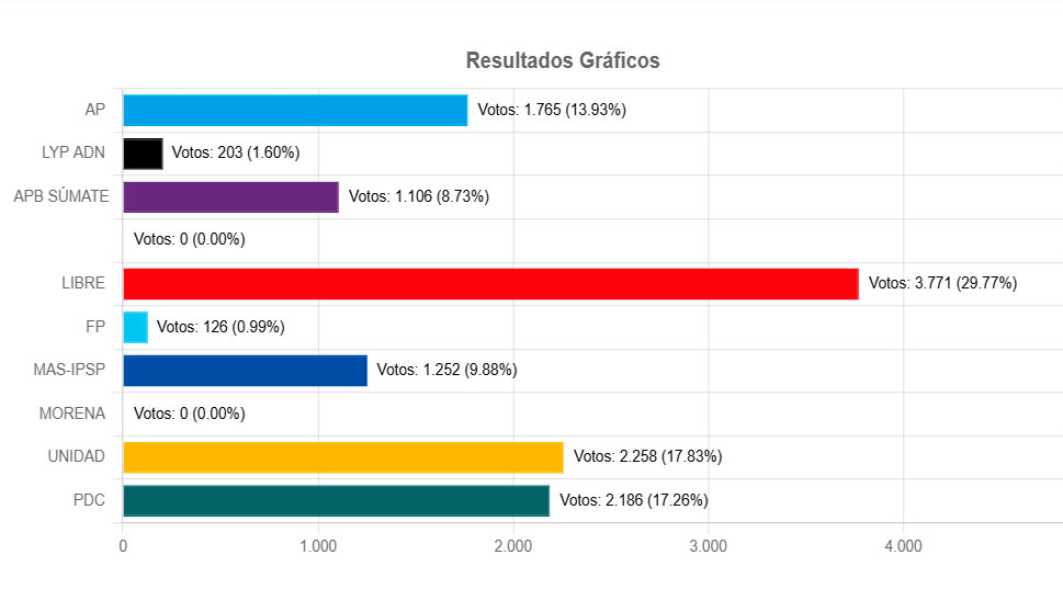 De los votos válidos, el 29,04% eligió a Tuto Quiroga de Libre, mientras que en el segundo lugar está el PDC con 21,67% seguido de Unidad con 21,51%. Entre el segundo y tercero la diferencia es de 90 votos.