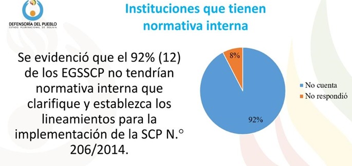 Al respecto, el INFORME DEFENSORIAL: BEATRIZ (2024) sobre la atención de la ILE en los Entes Gestores de Seguridad Social de Corto Plazo (Cajas de Salud), evidencia que la mayoría de estos centros hospitalarios no cuentan con norma interna para la aplicación de la ILE, como se muestra en el siguiente gráfico.