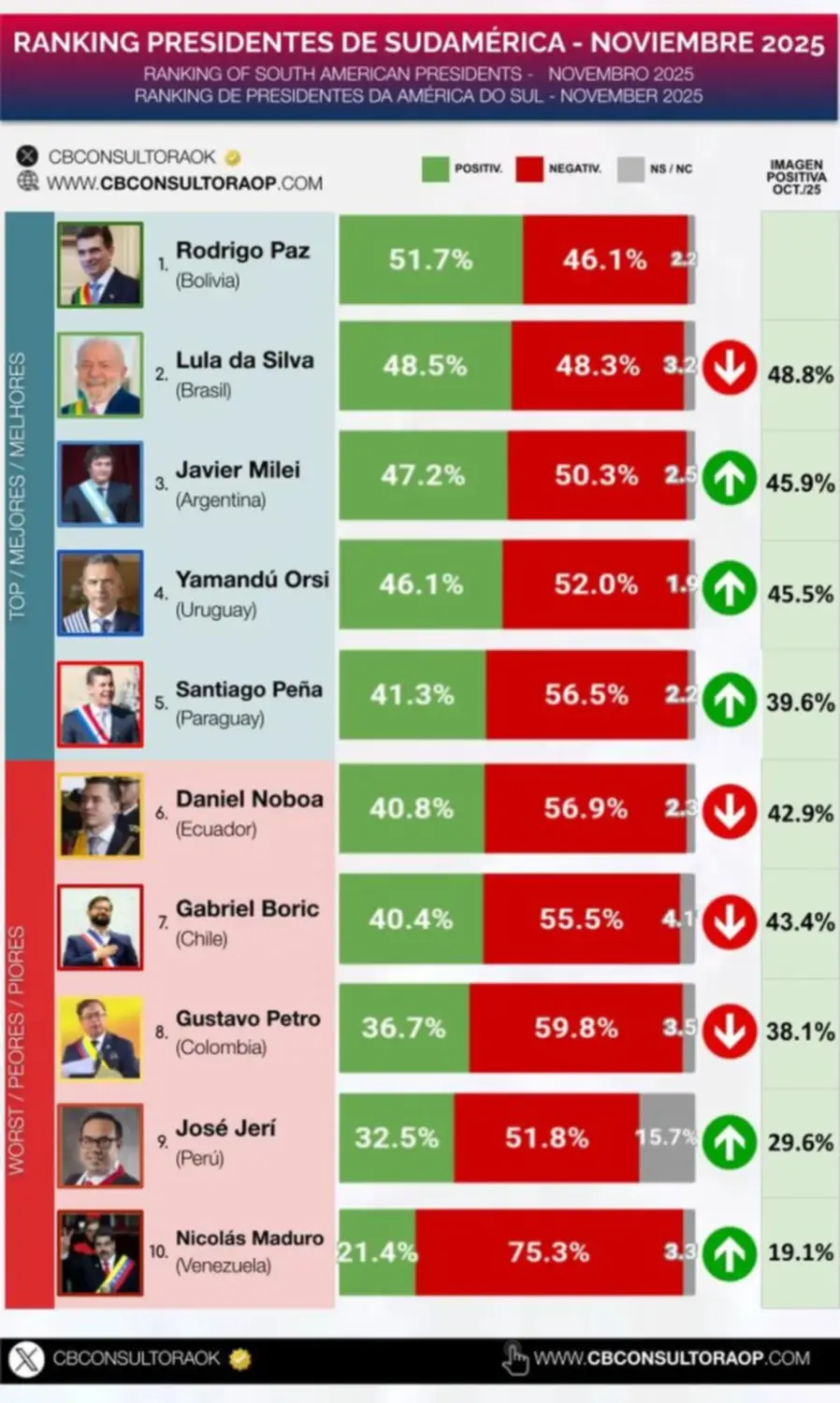 Rodrigo Paz, presidente de Bolivia, encabezó el ranking de aprobación de mandatarios sudamericanos correspondiente a noviembre de 2025. Con una imagen positiva del 51,7%, se posicionó como el líder regional del mes. En el extremo opuesto, Nicolás Maduro, de Venezuela, volvió a ubicarse último, con apenas 21,4%.