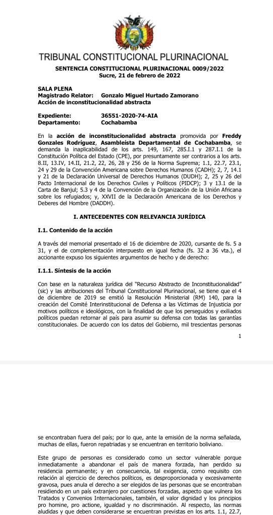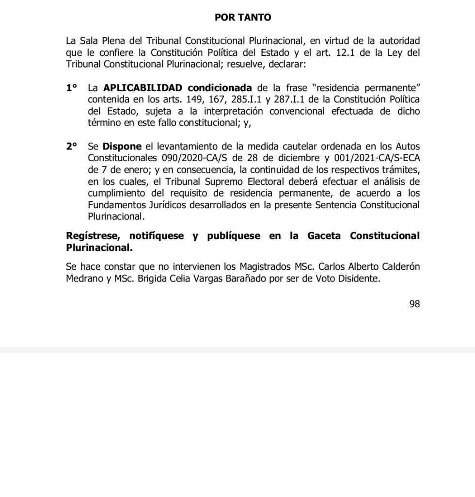 En este contexto, el presidente del Tribunal Supremo Electoral, Gustavo Ávila, en fecha 4 de diciembre de 2025 remarcó públicamente que el Tribunal Constitucional ya emitió diferentes sentencias en las que se protegen los derechos de los refugiados políticos. Estas decisiones establecen que quienes cuentan con dicha condición pueden acceder a una postulación y ejercer plenamente sus derechos políticos, sin que se les exija haber residido dos años de forma permanente y continua en el lugar donde realizarán su postulación. Este criterio constitucional refuerza el principio de protección y no restricción de los derechos políticos.
