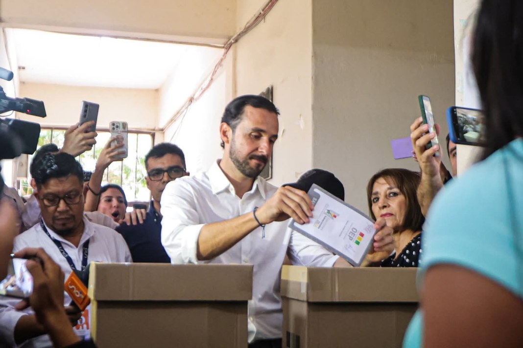 El candidato a la Gobernación de Santa Cruz, Juan Pablo Velasco, emitió su voto la mañana de este domingo en la unidad educativa Salesiano, en el marco de la jornada electoral.