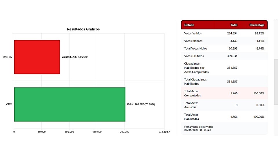 El Órgano Electoral Plurinacional de Bolivia, mediante el Sistema de Consolidación Oficial de Resultados de Cómputo en Proceso, dio a conocer los datos oficiales correspondientes a la Elección de Autoridades Departamentales 2026, Segunda Vuelta para Gobernador en el departamento de Tarija, con 1.776 actas computadas, equivalentes al 100%.
